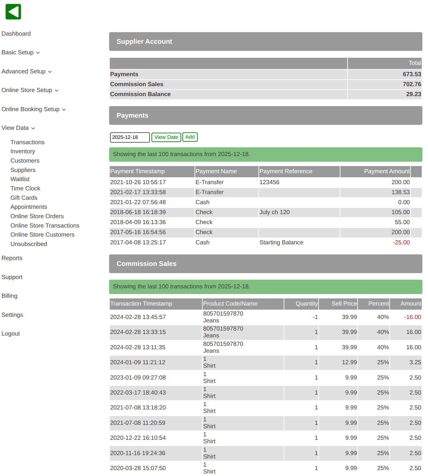 - A list of supplier consignment commission sales is displayed.