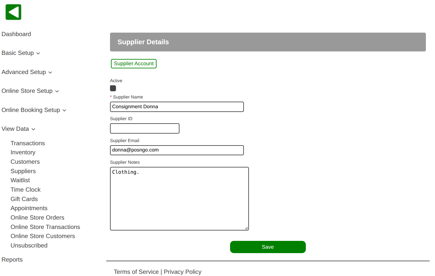 - All supplier information can be viewed and updated including the name, supplier ID, email address, and notes.