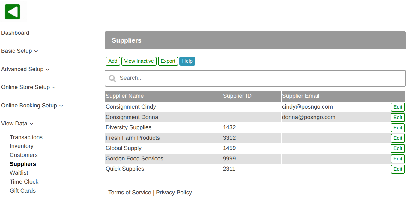 - Suppliers are viewed and managed in the web portal, View Data, Suppliers.